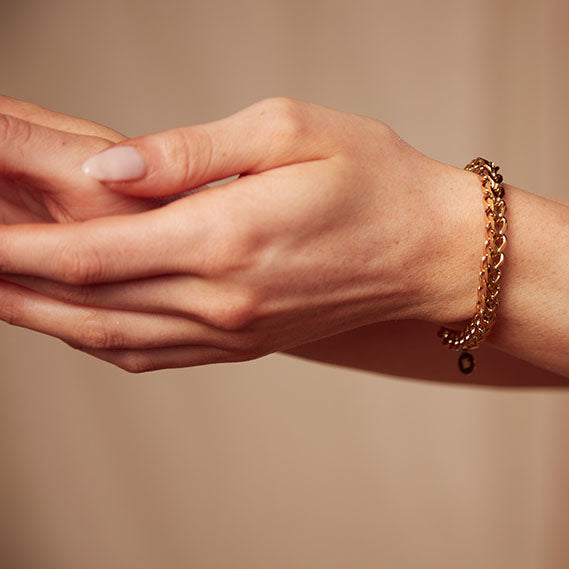 Our Cubic Gold Curb Bracelet is one of our signature designs that you won't find anywhere else. The cubic squared effect featuring tight-polished-flat links make this a standout choice. Comes with a 3.5cm extension and branded gold disc for that added touch of luxury.