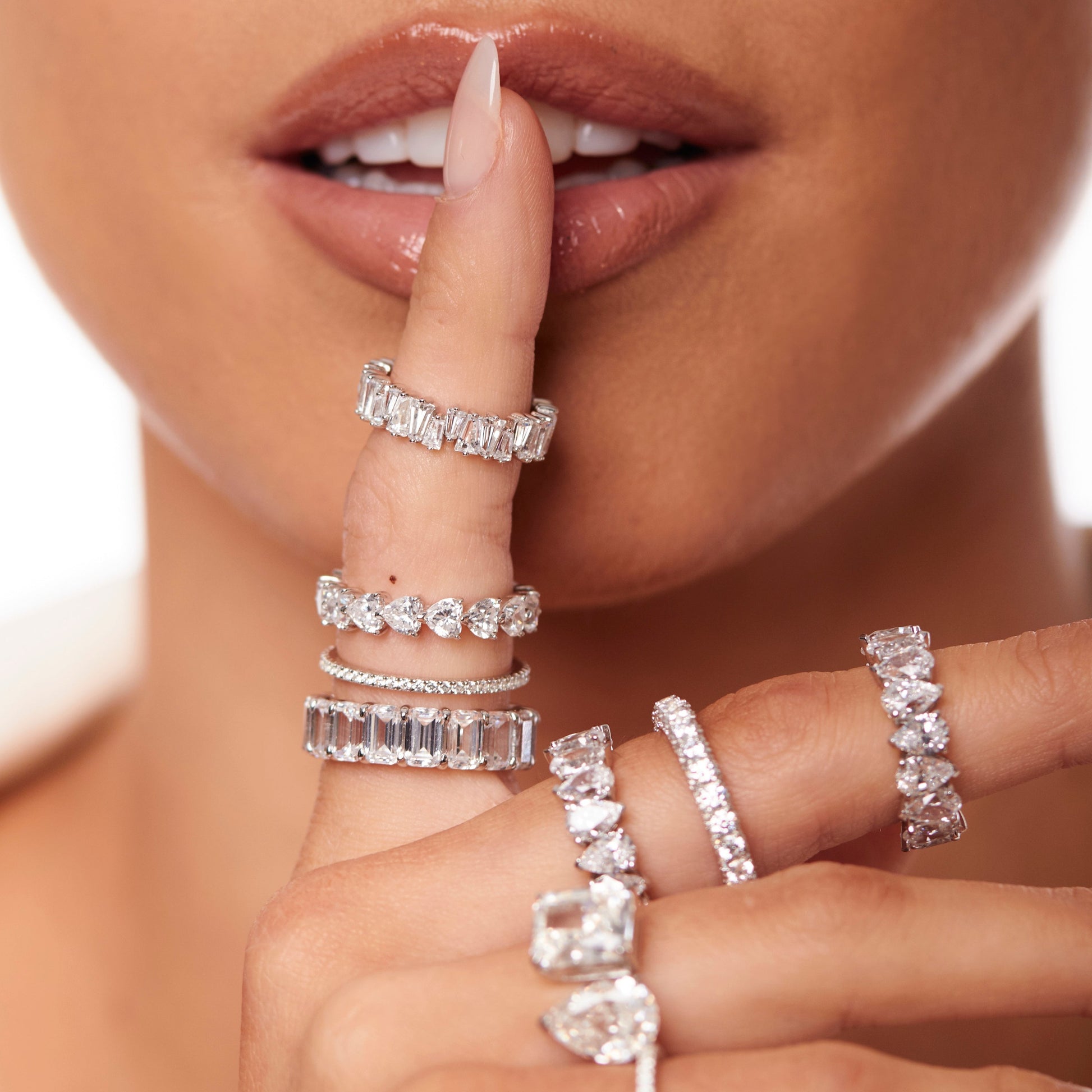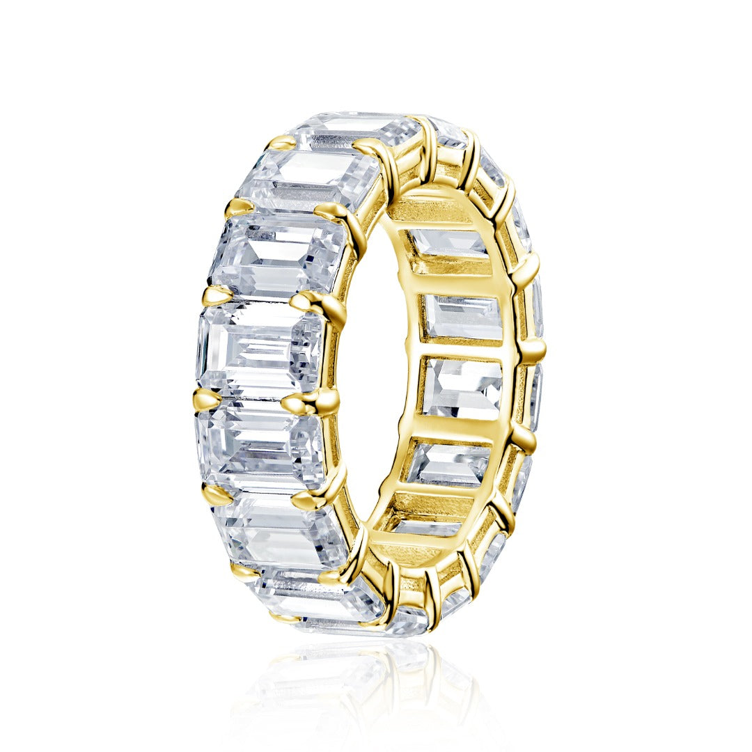 A striking and elegant twist on the classic wedding band. The individual emerald cut zirconia stones are meticulously hand set in an unbroken line that encircles the entirety of the ring to create the ultimate radiant appearance. Wear alone or with our matching emerald earring and bracelet to complete your look.