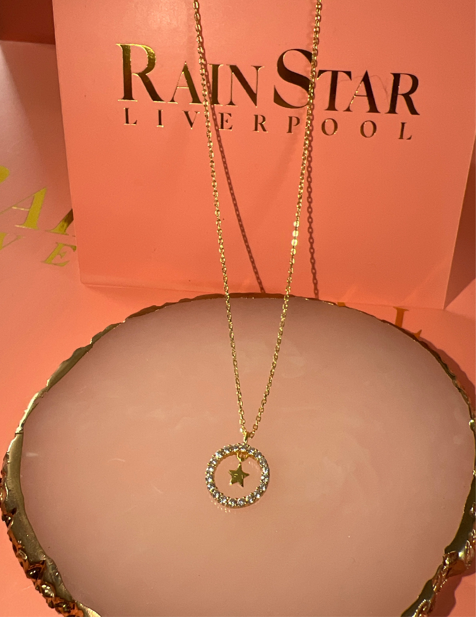 The halo shaped disc pendant features highest grade zirconia stone accents which are accentuated by a floating star.