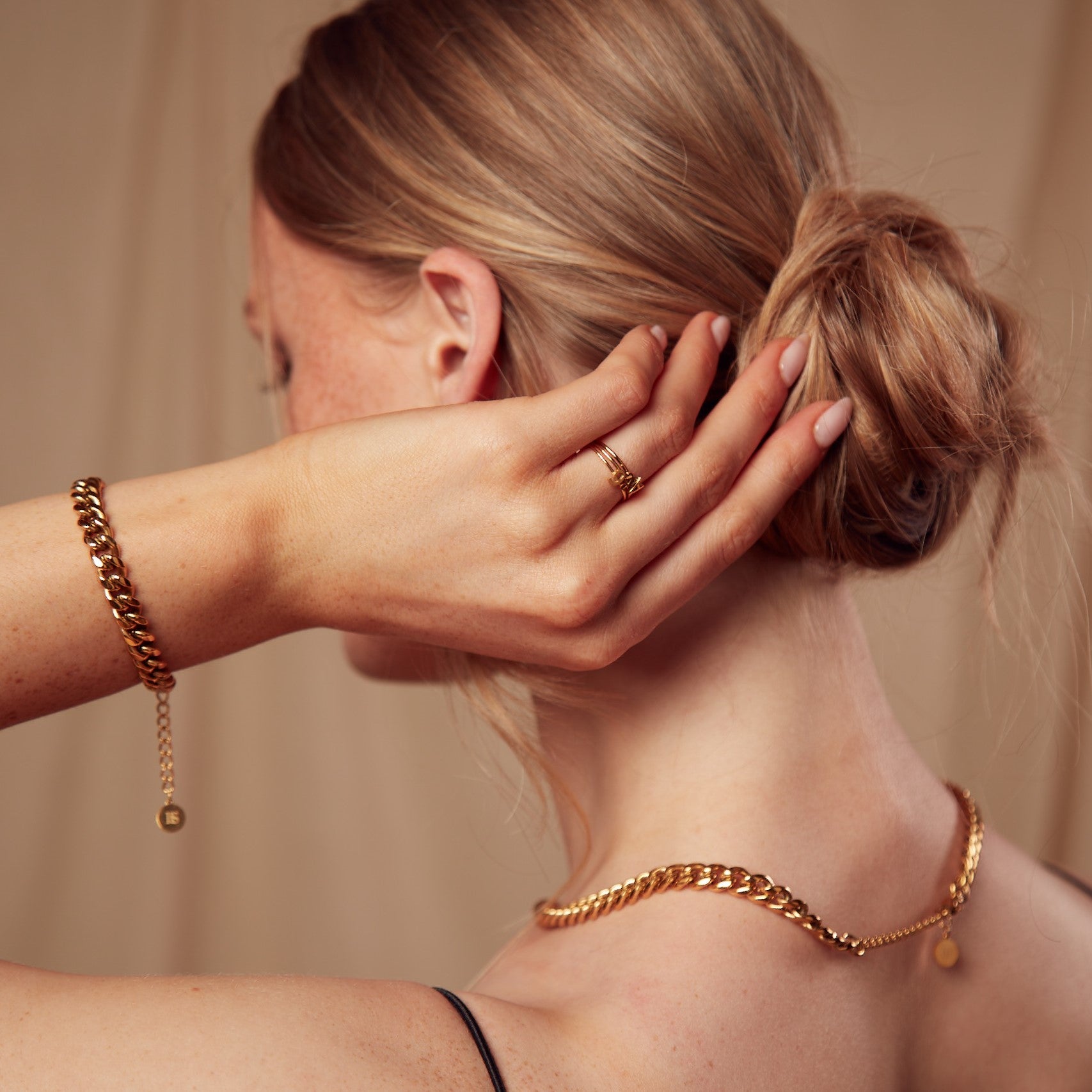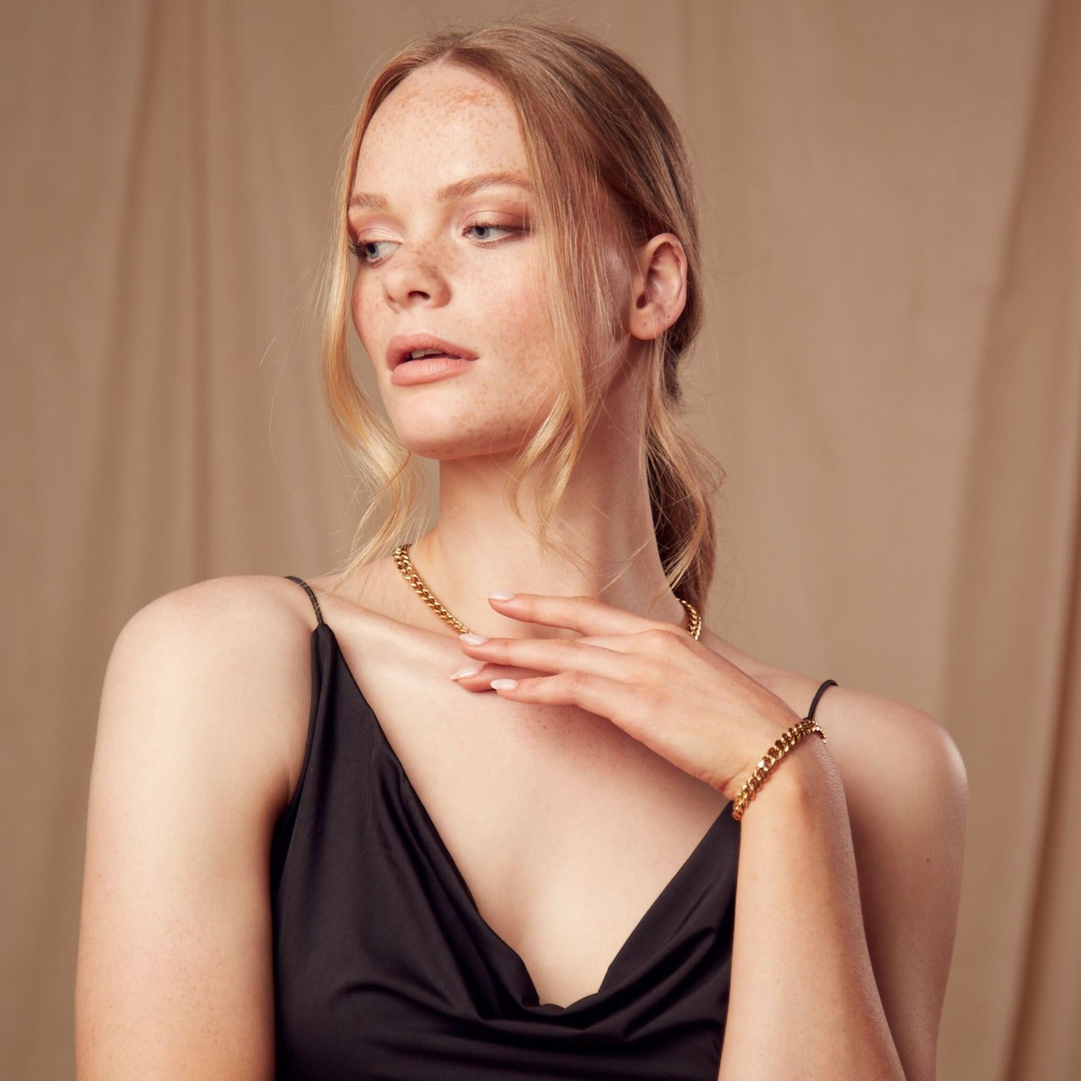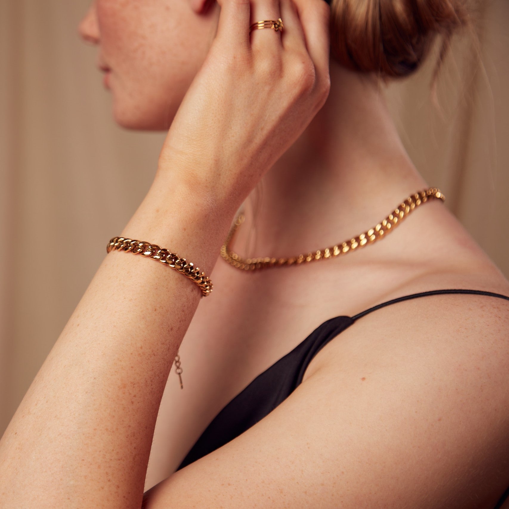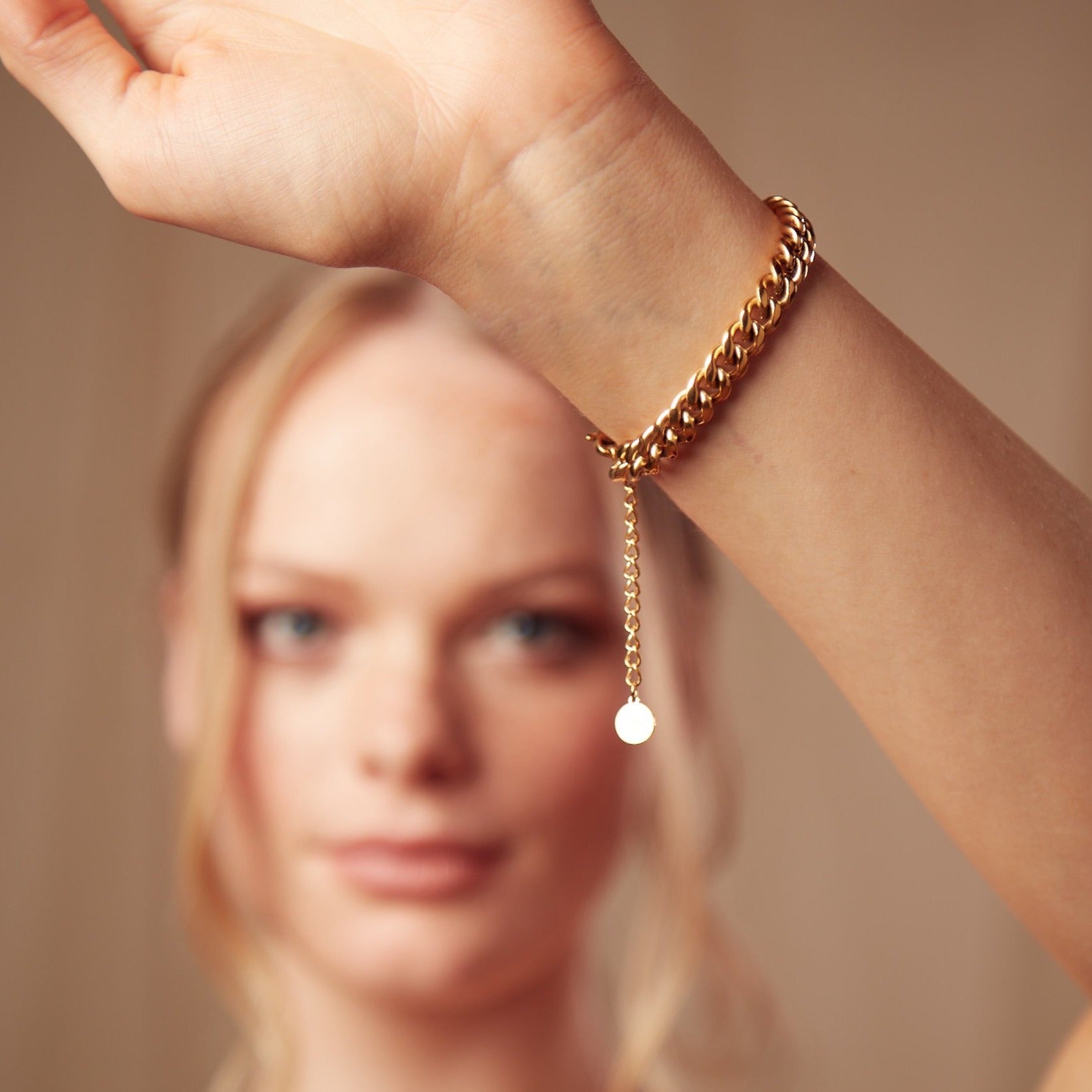 Our Roman Gold Curb bracelet is the ultimate statement chain. The timeless design featuring tight-polished-flat links make this a must-have staple piece. Comes with a 3.5cm extension and branded gold disc for that added touch of luxury. Perfect addition to a layered look for that 'edgy/bold' style, or a more subtle dash of gold to make your outfit sparkle. Our latest selection of dainty chains can be found here